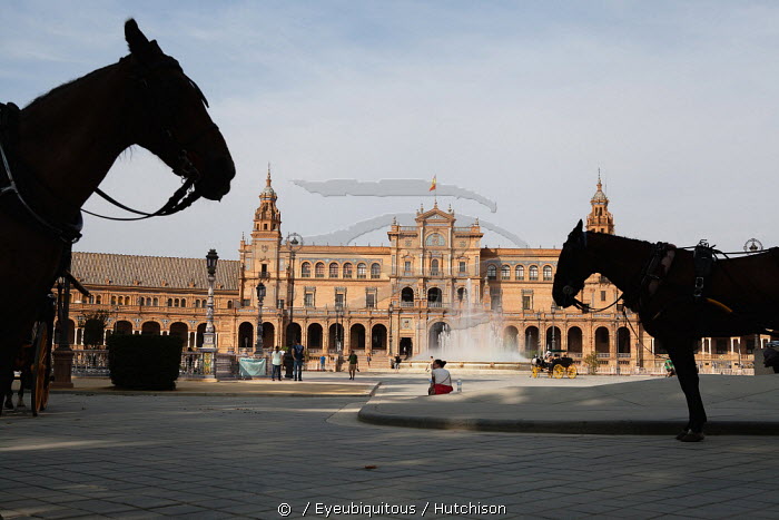 Spain, Andalucia, Seville, Plaza de Espana with horse-drawn carriages for hire in shadow in the foreground.