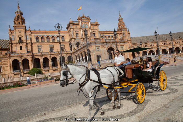Spain, Andalucia, Seville, Plaza de Espana with horse-drawn carriage taking tourists for a ride in the foreground.