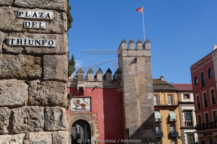 Spain, Andalucia, Seville, Gate and portal to the entrance of the Alcazar with the street sign for Plaza del Triunfo in the foreground to the left.