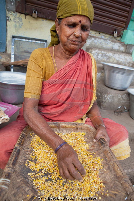 India, Tamil Nadu, Tiruchirappalli, Trichy, Woman winnowing maize in the market at Trichy.