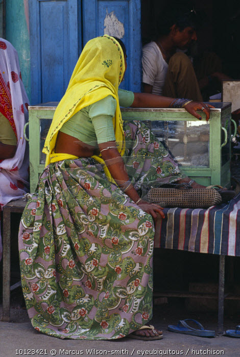 Woman in rose patterned sari and yellow head covering wearing ankle and toe ringsand bracelets sitting outside jewellery shop. Asia Asian Bharat Female Women Girl Lady Inde Indian Intiya Jewelry One individual Solo Lone Solitary Rajasthani Store