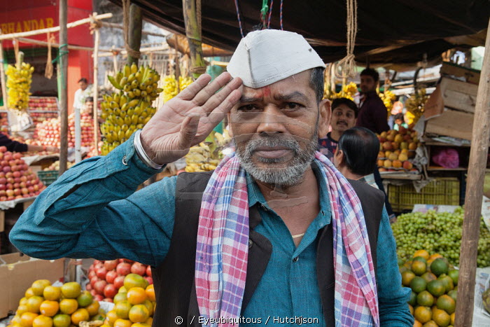 India, Bihar, Gaya, Portrait of a Hindu man in a Nehru cap giving a salute.