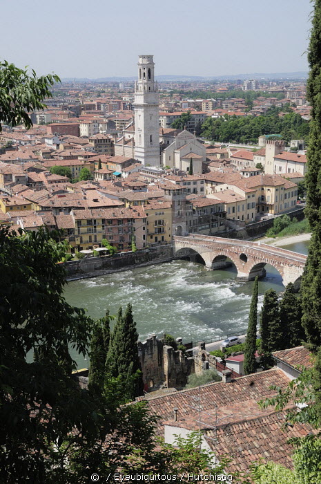 Italy, Veneto, Verona, city views from Teatro Romano of Ponte Pietra & Duomo.