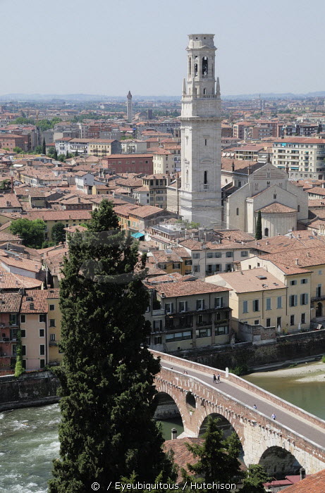 Italy, Veneto, Verona, city views from Teatro Romano of Ponte Pietra & Duomo.