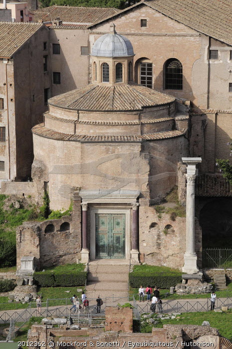 Italy, Lazio, Rome, The Palatine, Farnese Gardens, views from the gardens onto the Forum with the Temple of Romulus.