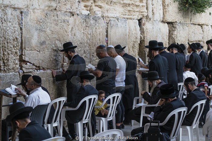 Israel, Jerusalem, Western Wall, Jewish men worship at the Western Wall of the Temple Mount in the Jewish Quarter of the Old City. The Old City of Jerusalem and its Walls is a UNESCO World Heritage Site.