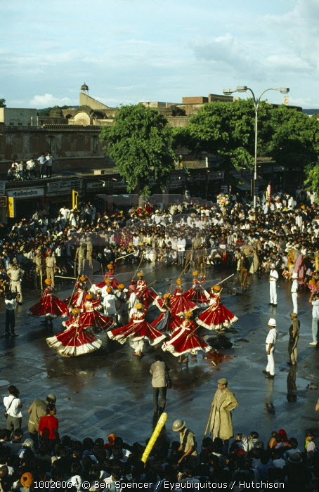 India, Rajasthan, Jaipur, Crowds watching traditional dance at Teej Festival celebrating the onset of the monsoon.