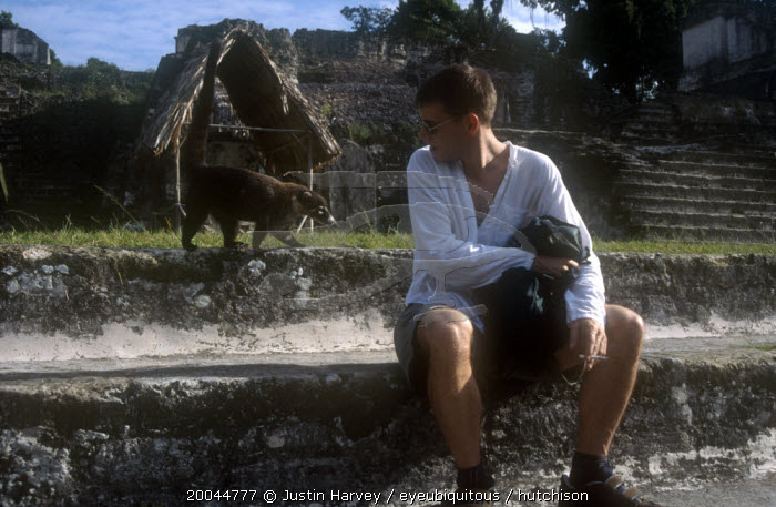 Tourist smoking a cigarette with Coati walking along the wall behind in the main Plaza