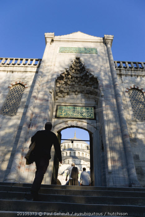 Turkey, Istanbul, Sultanahmet Camii, The Blue Mosque Courtyard and dome seen through the exit to the Hippodrome with people entering through doorway.