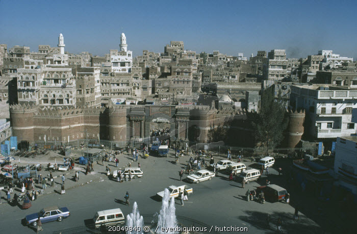 Aerial view overlooking the Old City with the city walls and entrance in the foreground with passing cars and pedestrians below