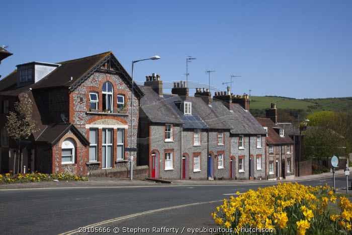England, East Sussex, Lewes, Row of terraced houses in Little East Street with daffodils in the foreground.
