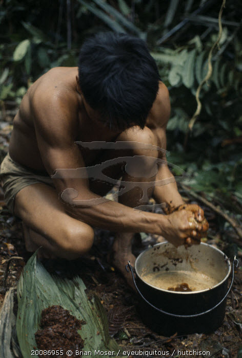 Maku nomadic hunter Umero preparing curare from root liana and bark scrapings. Once boiled to gluey consistency used as poison for blowpipe dart heads.Final process of dipping dart heads into curare then allowing to dry always completed in cool of nighti
