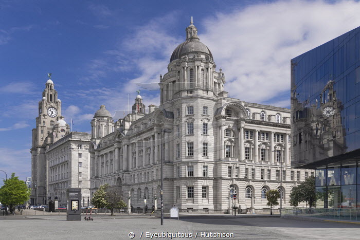 England, Lancashire, Liverpool, Pier Head, Group of buildings known collectively as The 3 Graces consisting of the Royal Liver Building, The Cunard Building and the Port of Liverpool Building.
