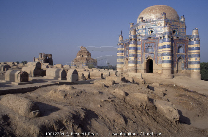Tomb of Bibi Jawindi with domed roof and two similar crumbling buildings with dusty graveyard in the foreground2 Asia Pakistani Religion
