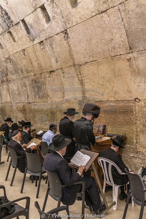 Israel, Jerusalem, Western Wall, Jewish men worship in the synagogue under Wilson's Arch at the Western Wall of the Temple Mount in the Jewish Quarter of the Old City. The Old City of Jerusalem and its Walls is a UNESCO World Heritage Site.