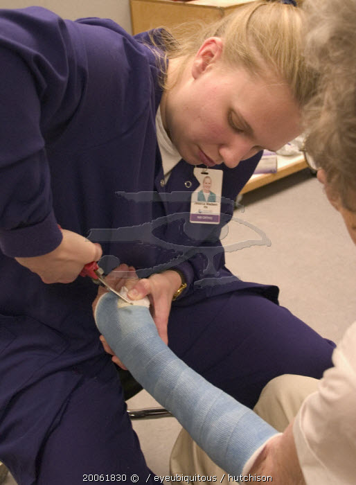 Clinic nurse making adjustments to cast with cutter for elderly patient with a broken wristAges 28 and 90.