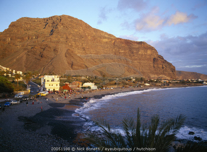 Valle Gran Rey. Crowds on black volcanic sand beach at sunset.
