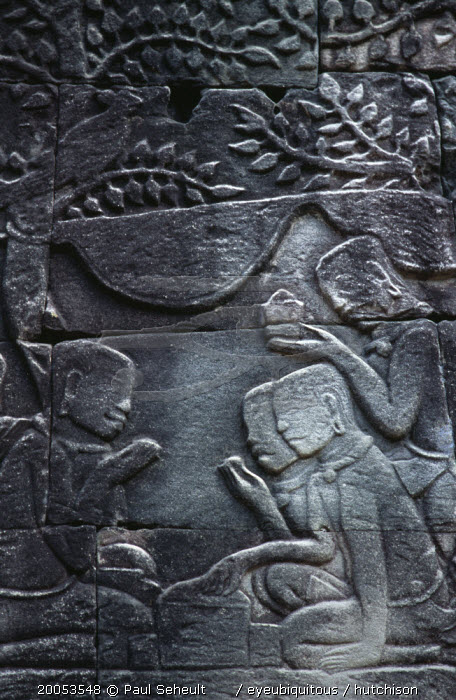 The Bayon. Bas relief carvings on the south wall depicting everyday scenes. Eating a meal.Asian Cambodian Kampuchea Southeast Asia History Kamphuchea