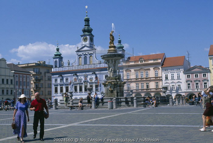 Czech Republic, South Bohemia, Ceske Budejovice, Town Square with Samson fountain and Town Hall behind people sitting and walking.