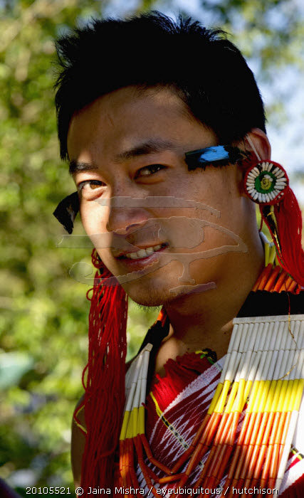 India, Nagaland, Naga Warrior in traditional costume and jewelry.