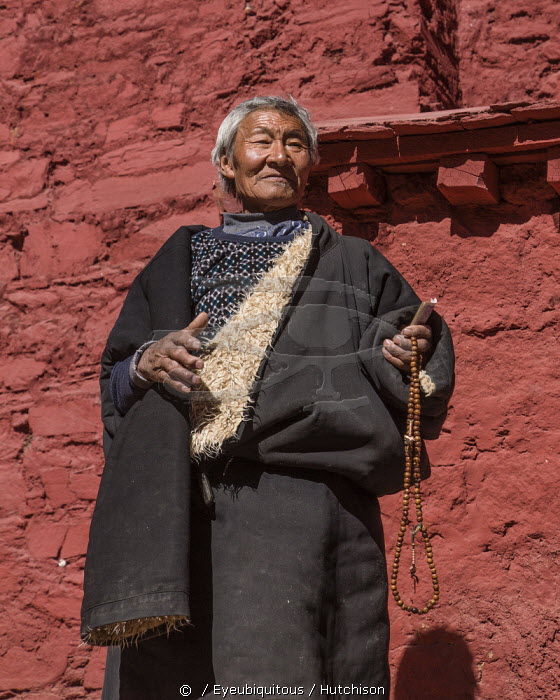 A Tibetan Buddhist pilgrim from the Kham region of eastern Tibet at the Drepung Monastery near Lhasa, Tibet. He is wearing the heaving sheepskin-lined chuba or chupa coat and is carrying his mala rosary beads.