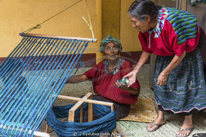 Guatemala, Solola Department, Santa Cruz la Laguna, An older Cakchiquel Mayan woman in traditional dress winds thread on a frame to prepare for weaving on a back loom as her friend comes over to help her.