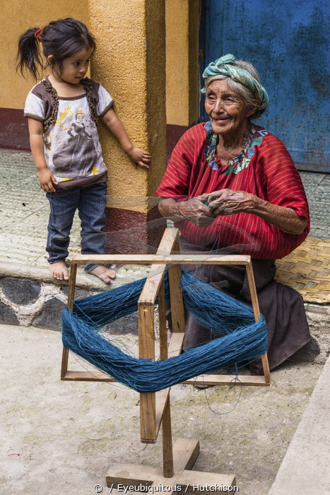 Guatemala, Solola Department, Santa Cruz la Laguna, An older Cakchiquel Mayan woman in traditional dress winds thread on a frame to prepare for weaving on a back loom as a little girl watches.
