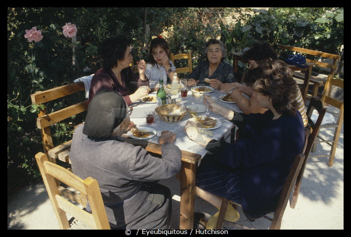 Greece, Pilion, Family having outdoor lunch around table.