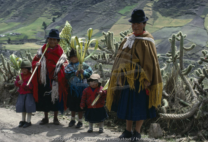 Family on roadside returning home from Palm Sunday Mass holding woven and shaped palm fronds with line of cacti and patchwork fields on hillside behind.