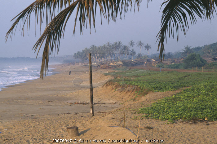 The beach and distant buildings part framed by palm fronds.C™te d Ivoire