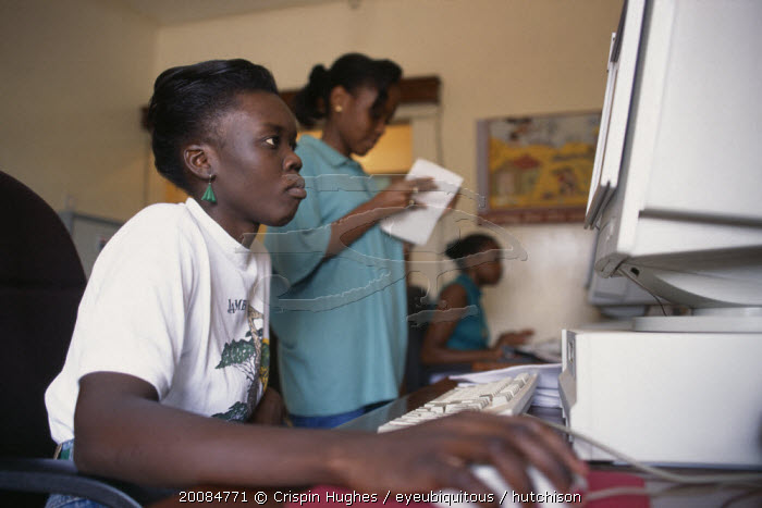 Woman working on computer in WFP Ntiuda Stores supplying convoys to Rwanda and Sudan.World Food Programme African Eastern Africa North Africa Rwandan Sudanese Ugandan Female Women Girl Lady Female Woman Girl Lady