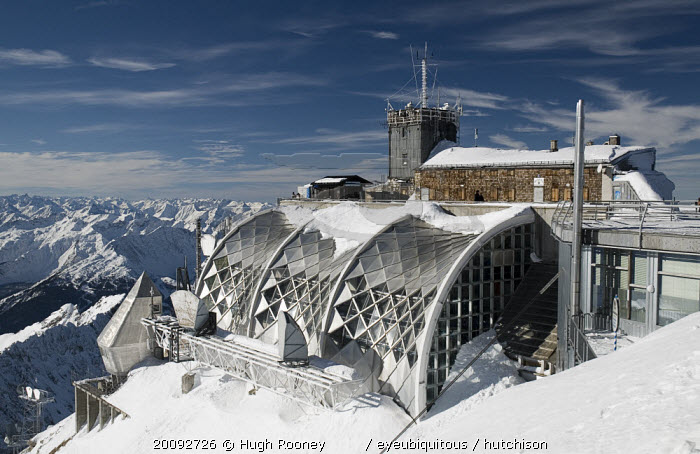 Terrace viewpoint on summit of Zugspitze with various buildings.Mountains Architecture Snow Bayern Deutschland European Scenic Western Europe