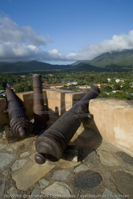 VENEZUELA, Margarita Island, La Asuncion, Canons at the terrace of Castillo de Santa Rosa fort facing the valley and the La Asuncion small town.