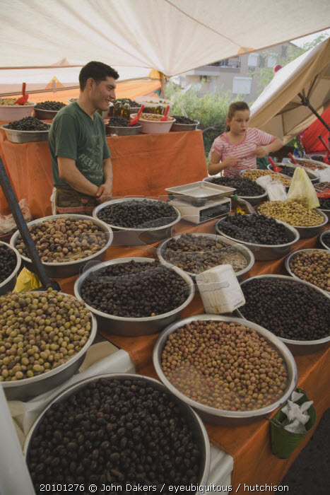 Turkey, Aydin Province, Kusadasi, Stall at weekly market selling olives and nuts with male stall holder and young girl standing behind display and set of electronic scales.