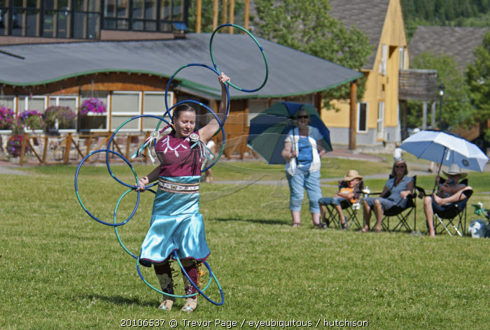 Canada, Alberta, Waterton Lakes National Park, Blackfoot Arts & Heritage Festival to celebrate Parks Canada's centennial, Hoop dancerfrom the Samson Cree Nation, Tourists watching the event, Waterton Lakes National Park is a UNESCO World Heritage Site.