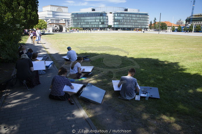 Poland, Warsaw, Plac Marszalka Jozefa, modern Metropolitan building with scholl kids sketching in the foreground.