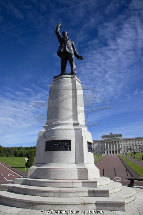 Ireland, North, Belfast, Stormont assembly building with statue of Lord Edward Carson in the foreground.