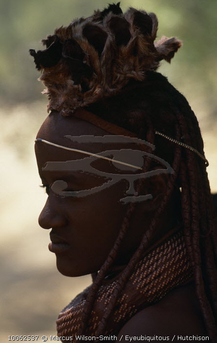 Namibia, People, Himba, Head and shoulders portrait of young Himba girl wearing traditional head dress and bead jewellery.