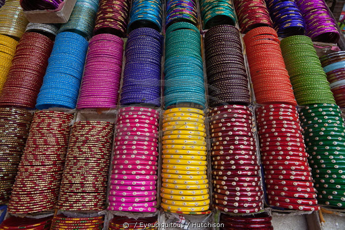 India, West Bengal, Kolkata, Bangles on display in a shop in the Bara Bazar district.
