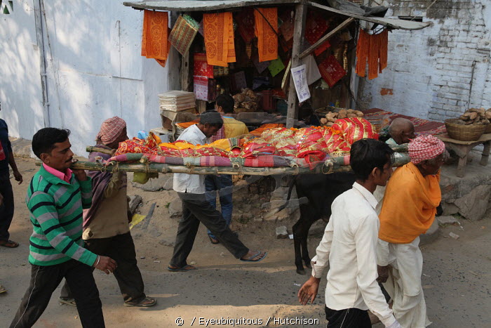 India, Bihar, Gaya, A body is carried through the streets of to the cremation site on the ghats of the Phalgu River.