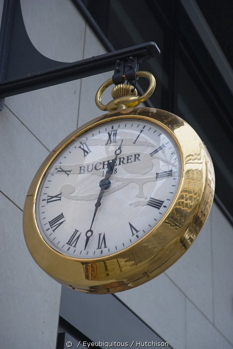 Germany, Berlin, Mitte, Friedrichstrasse, Brass pocket watch shop sign.