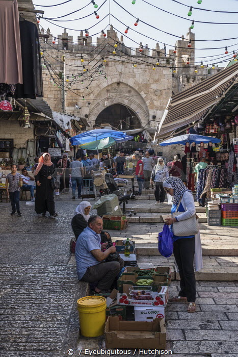 Israel, Jerusalem, Shoppers in the street market by the Damascus Gate in the Muslim Quarter of the Old City. The Old City of Jerusalem and its Walls is a UNESCO World Heritage Site.