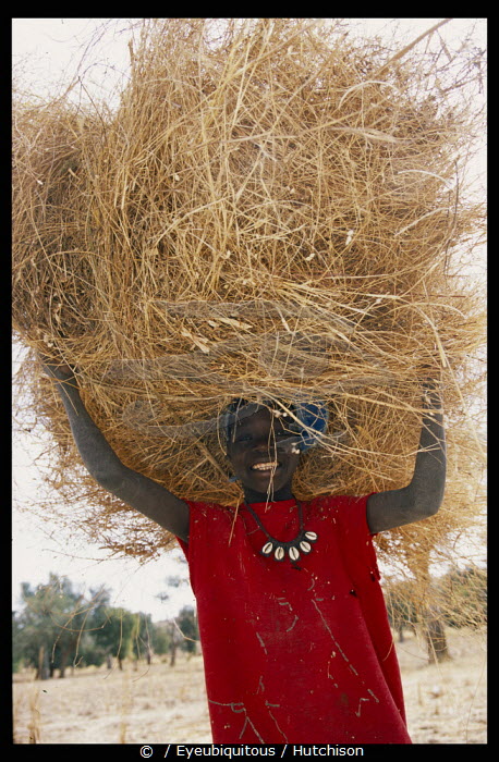 Mali, Pays Dogon, Tirelli, Portrait of a smiling boy called Simon Saye with hay on his head and wearing a cowrie necklace.