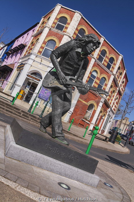 Ireland, County Donegal, Ballyshannon, sculpture of the late Irish rock guitarist Rory Gallagher by Scottish artist David Annand completed in 2010.