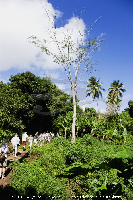 Cruise ship tourists trekking through the jungle interior towards Royal Mount Carmel Waterfall.Caribbean Destination Destinations Grenadian Greneda West Indies Grenada Ecology Entorno Environmental Environnement Green Issues Holidaymakers Immature Old Senior Aged Scenic Tourism