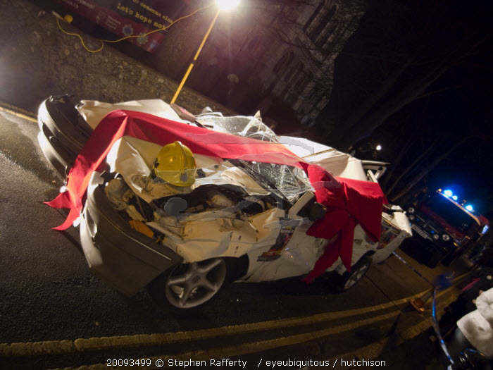 Wrecked car wrapped in red bow as part of a police anti Drink Drive campaign for the Christmas period.European Great Britain Northern Europe UK United Kingdom British Isles Automobile Automobiles Automotive Autos Cars Motorcar Xmas