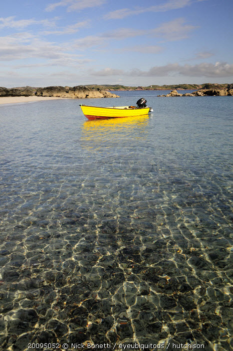 Yellow boat anchored in clear waters wide angleAlba Great Britain Northern Europe UK United Kingdom British Isles European Alba Great Britain Northern Europe UK United Kingdom British Isles European